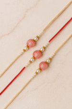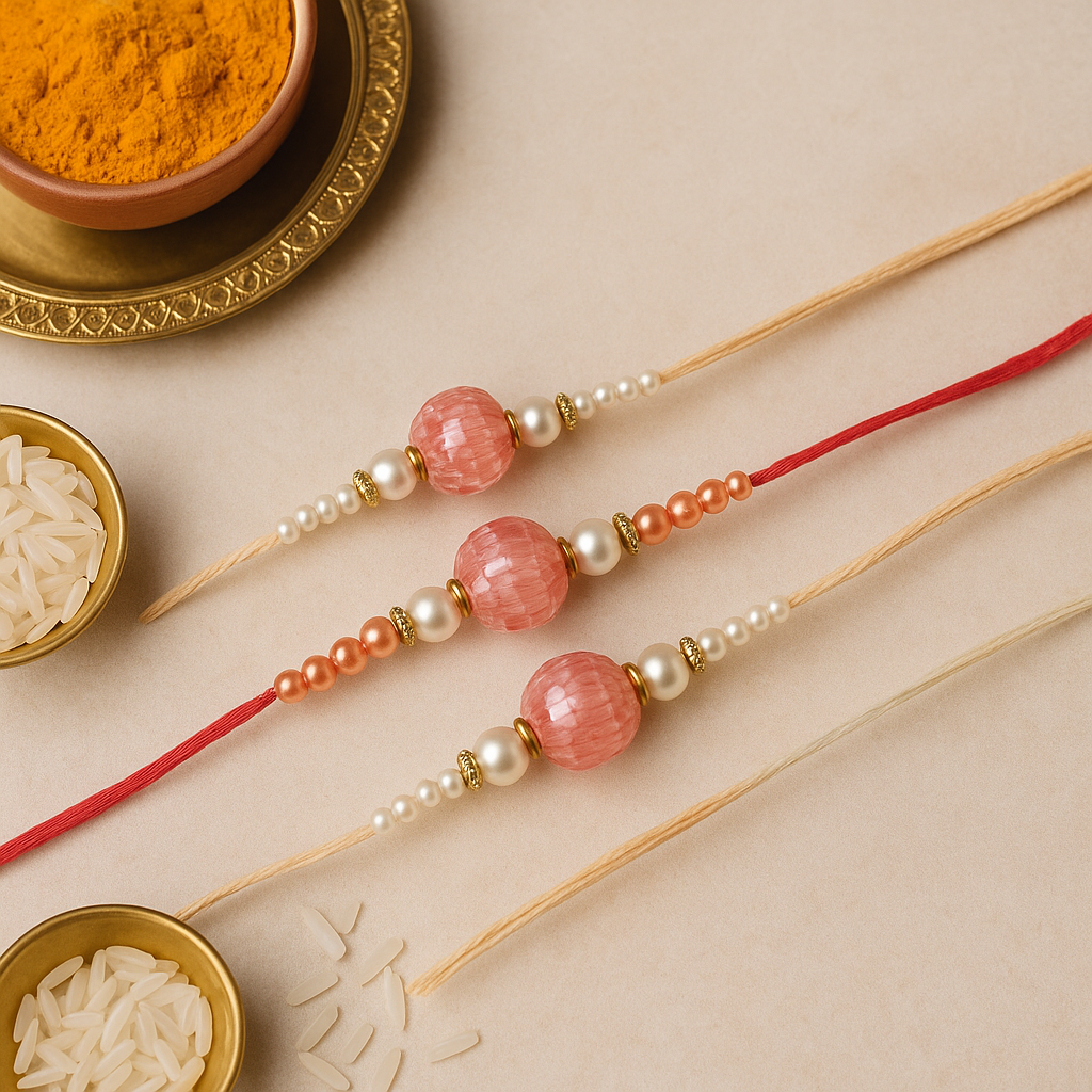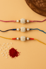 Exquisit beads are bordered with soothing tiny pearl clusters and accentuated with white perl beads. The look of this 3 rakhis set is enhanced with pretty embellishments and textured beads that match the centre and tied with matching soft yarn.Simple yet preety Rakhi perfect for those who look for simple elegant rakhi for their brother.