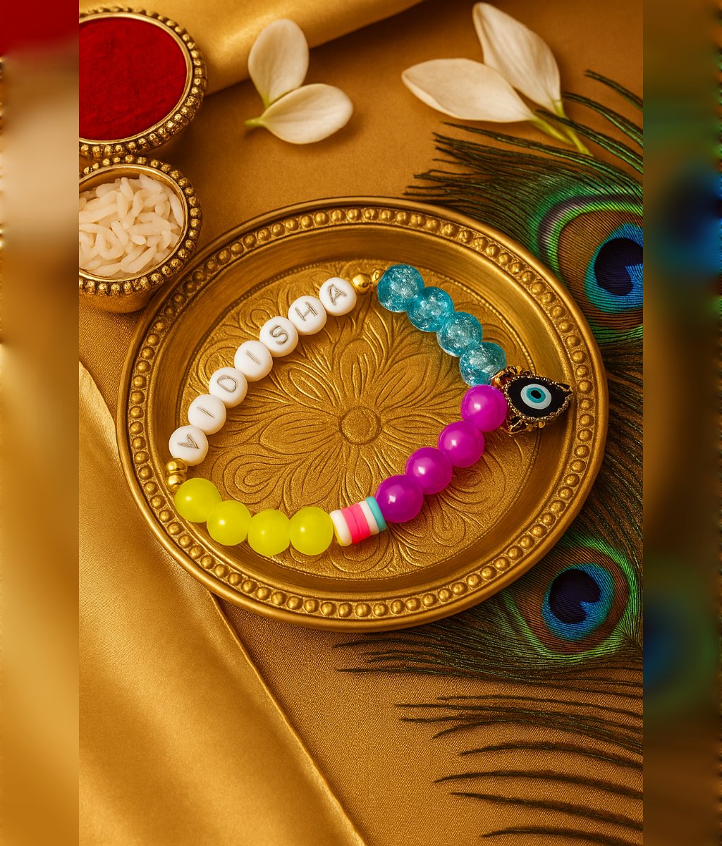 Beautiful and Colorful assorted beads customized bracelet with their name on it paired with kid girl’s most favorite Unicorn charm and rainbow rings makes it more lovely to wear on wrist. Multipurpose usage ,regular wear ,occasion wear ,best gift for kid sister from their brother and also to friends on friendship day.Charms can be further used as bag charm and keychain for kids.