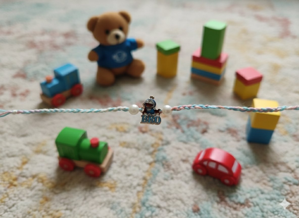 Celebrating the sweetest bond with this cute rakhi that features blue doremon metal charm gloves giving it a unique look. It is versatile making it suitable for daily wear and perfect for siblings who like to stand out in a crowd. This rakhi is a unique masterpiece made using the finest quality cotton thread The metal charm can also be transformed into a pendant or bracelet Make your celebrations lively with this adorable rakhi that will surely brighten your siblings day.