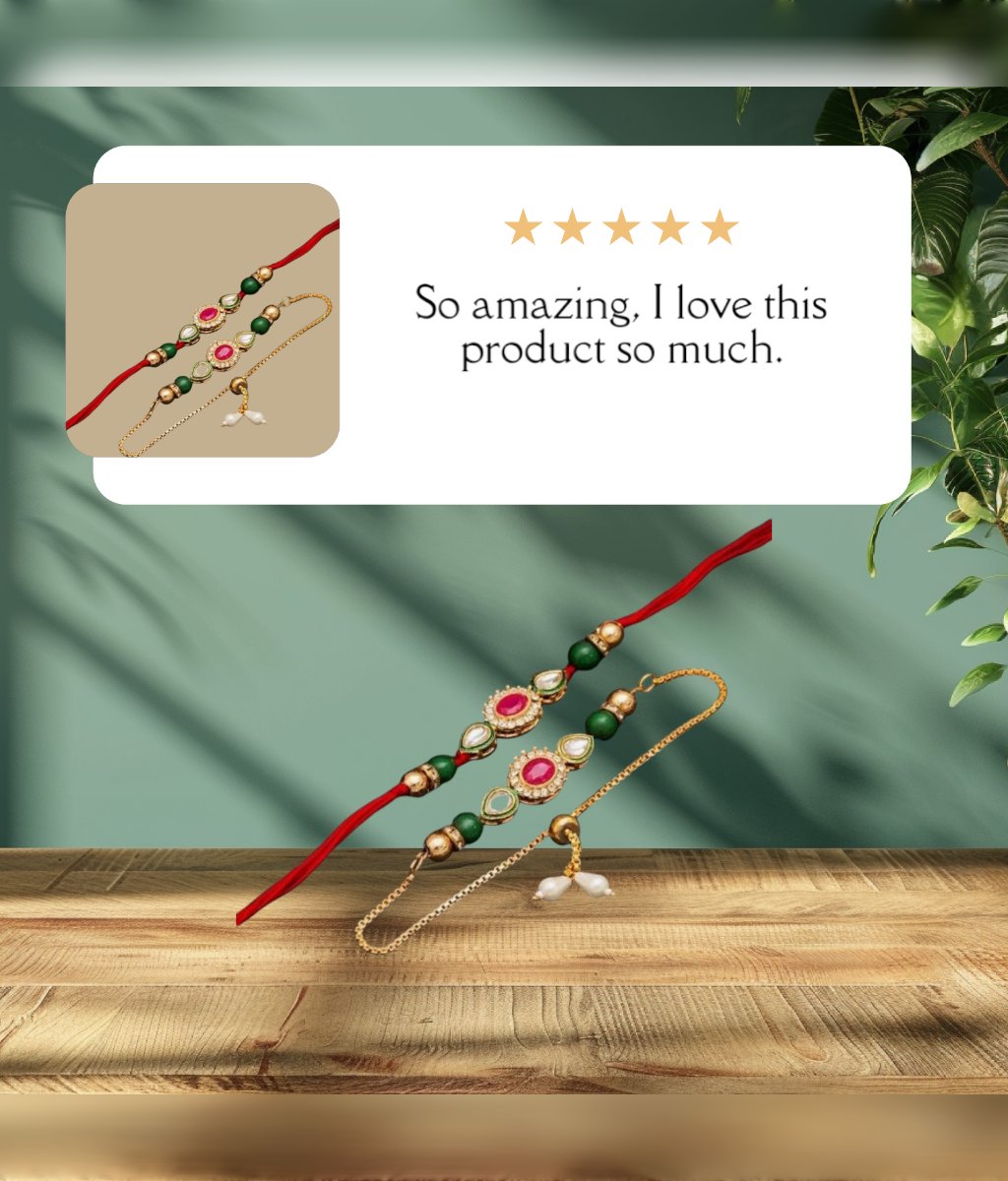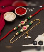 Envelop your Bhaiya and Bhabhi in love this Raksha Bandhan with this graceful rakhi set. The Bhaiya rakhi features a refined arrangement of sparkling Kundan stones and elegant green beads, exuding sophistication. The Bhabhi rakhi complements it beautifully with a delicate central Kundan piece surrounded by shimmering golden beads and charming dangling accents. , this set beautifully symbolizes your affection and heartfelt wishes for their enduring happiness together.